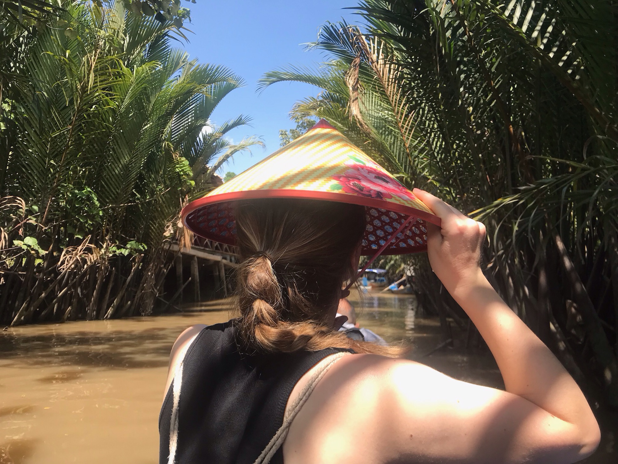 The highlight of the day, though, came after lunch: gliding through the narrow channels of the delta on a small wooden boat, the water shaded by arching walls of bamboo and palm.